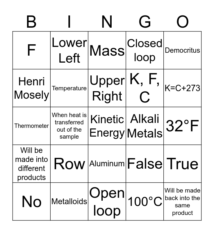 This bingo card has a free space and 24 words: Row, Metalloids, Upper Right, No, Democritus, F, Henri Mosely, Lower Left, Alkali Metals, Aluminum, K, F, C, Thermometer, False, True, Temperature, 100°C, 32°F, Mass, K=C+273, When heat is transferred out of the sample, Will be made back into the same product, Will be made into different products, Closed loop and Open loop.
