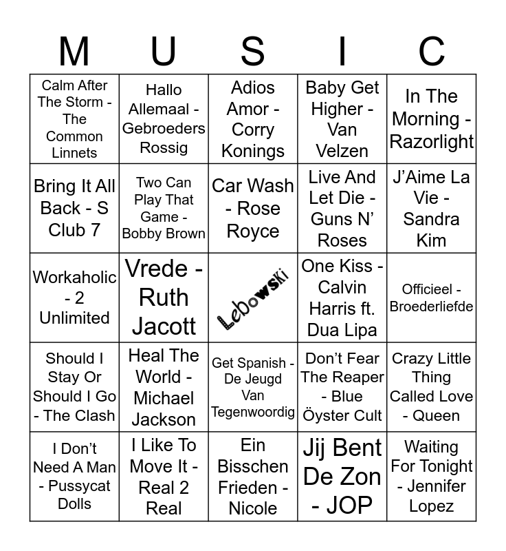 This bingo card has a free space and 24 words: Heal The World - Michael Jackson, I Like To Move It - Real 2 Real, Car Wash - Rose Royce, I Don’t Need A Man - Pussycat Dolls, In The Morning - Razorlight, Calm After The Storm - The Common Linnets, Bring It All Back - S Club 7, Hallo Allemaal - Gebroeders Rossig, One Kiss - Calvin Harris ft. Dua Lipa, Get Spanish - De Jeugd Van Tegenwoordig, Live And Let Die - Guns N’ Roses, Workaholic - 2 Unlimited, Don’t Fear The Reaper - Blue Öyster Cult, Crazy Little Thing Called Love - Queen, Two Can Play That Game - Bobby Brown, Jij Bent De Zon - JOP, Officieel - Broederliefde, Adios Amor - Corry Konings, J’Aime La Vie - Sandra Kim, Vrede - Ruth Jacott, Waiting For Tonight - Jennifer Lopez, Should I Stay Or Should I Go - The Clash, Baby Get Higher - Van Velzen and Ein Bisschen Frieden - Nicole.