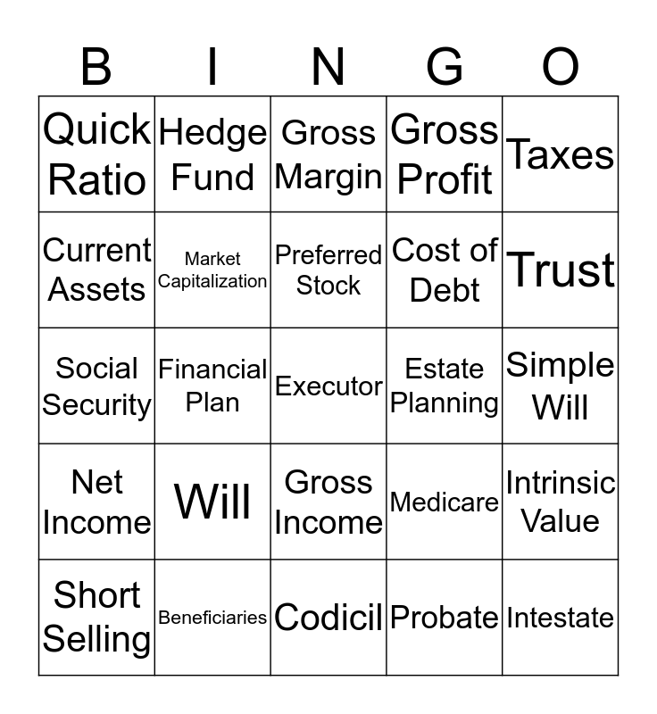 This bingo card has a free space and 29 words: Short Selling, Market Correction, Financial Plan, Discount Rate, Quick Ratio, Gross Margin, Market Capitalization, Will, Estate Planning, Beneficiaries, Simple Will, Intestate, Codicil, Probate, Trust, Grantor, Gross Income, Net Income, Taxes, Social Security, Medicare, Amortization, Cost of Debt, Current Assets, Gross Profit, Hedge Fund, Intrinsic Value, Preferred Stock and Retained Earnings.