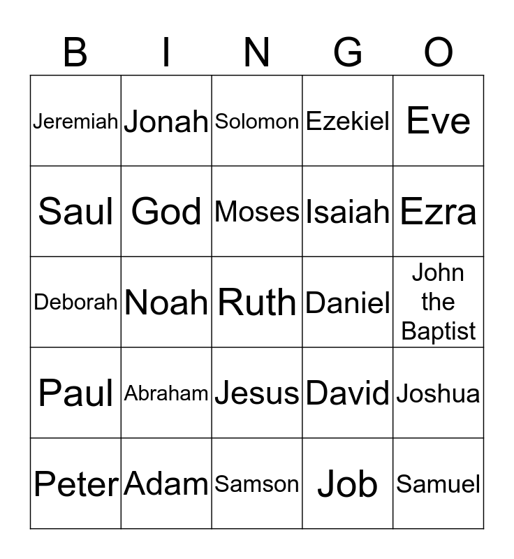 This bingo card has 25 words: Abraham, Samson, Moses, Peter, Eve, Jeremiah, Saul, Jonah, Daniel, Jesus, Isaiah, Deborah, David, Joshua, God, Samuel, John the Baptist, Solomon, Ezra, Noah, Ruth, Adam, Paul, Ezekiel and Job.