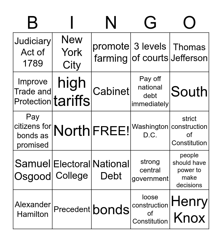 This bingo card has a free space and 24 words: Electoral College, Precedent, Cabinet, Alexander Hamilton, Thomas Jefferson, Judiciary Act of 1789, Improve Trade and Protection, New York City, Washington D.C., National Debt, Pay off national debt immediately, Pay citizens for bonds as promised, strong central government, people should have power to make decisions, high tariffs, loose construction of Constitution, strict construction of Constitution, promote farming, South, North, Henry Knox, Samuel Osgood, 3 levels of courts and bonds.