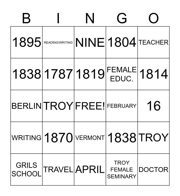 This bingo card has a free space and 24 words: 1870, TRAVEL, 1819, GRILS SCHOOL, TEACHER, 1895, 1838, READING/WRITING, FEBRUARY, VERMONT, FEMALE EDUC., BERLIN, 1838, TROY, 1787, TROY FEMALE SEMINARY, 16, NINE, 1814, TROY, DOCTOR, WRITING, 1804 and APRIL.