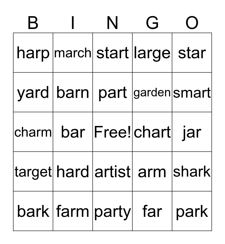 This bingo card has a free space and 32 words: far, car, bar, dark, target, barn, star, shark, march, art, part, start, yarn, dart, chart, card, bark, charm, artist, hard, arm, scar, jar, farm, park, large, garden, yard, harp, party, scarf and smart.