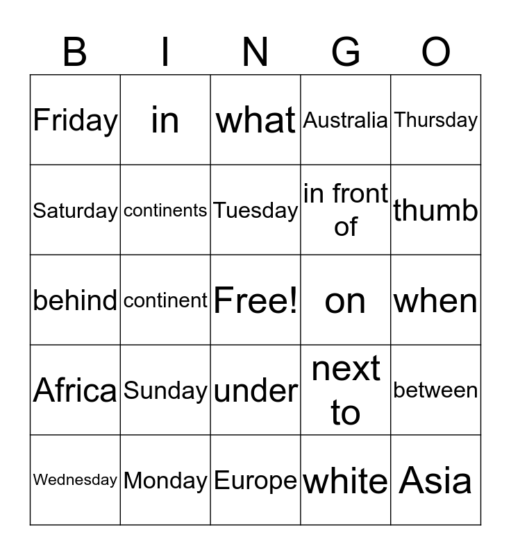 This bingo card has a free space and 24 words: Sunday, Monday, Tuesday, Wednesday, Thursday, Friday, Saturday, in, on, under, in front of, behind, next to, between, continents, white, when, what, thumb, continent, Asia, Africa, Australia and Europe.