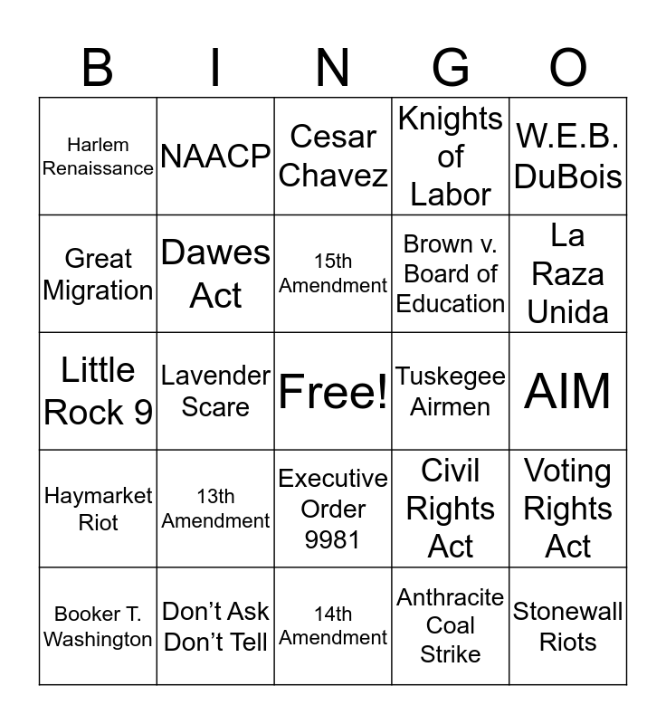 This bingo card has a free space and 25 words: 13th Amendment, 14th Amendment, 15th Amendment, Booker T. Washington, W.E.B. DuBois, Harlem Renaissance, Great Migration, NAACP, Tuskegee Airmen, Executive Order 9981, Brown v. Board of Education, Little Rock 9, Civil Rights Act, Voting Rights Act, Dawes Act, Navajo Code Talkers, AIM, Cesar Chavez, La Raza Unida, Lavender Scare, Stonewall Riots, Don’t Ask Don’t Tell, Haymarket Riot, Knights of Labor and Anthracite Coal Strike.