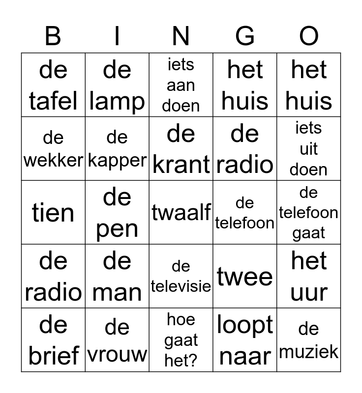 This bingo card has a free space and 24 words: de man, de vrouw, de krant, de brief, het huis, de tafel, de wekker, de lamp, de telefoon, de televisie, de radio, tien, twee, het uur, de kapper, loopt naar, de telefoon gaat, iets aan doen, iets uit doen, de pen, de muziek, de radio, het huis and hoe gaat het?.