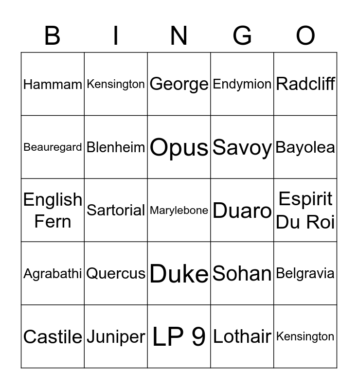 This bingo card has 25 words: Quercus, LP 9, Opus, Castile, Radcliff, Hammam, Beauregard, Kensington, Duaro, Duke, Savoy, English Fern, Sohan, Belgravia, Blenheim, Kensington, Espirit Du Roi, George, Bayolea, Sartorial, Marylebone, Juniper, Agrabathi, Endymion and Lothair.