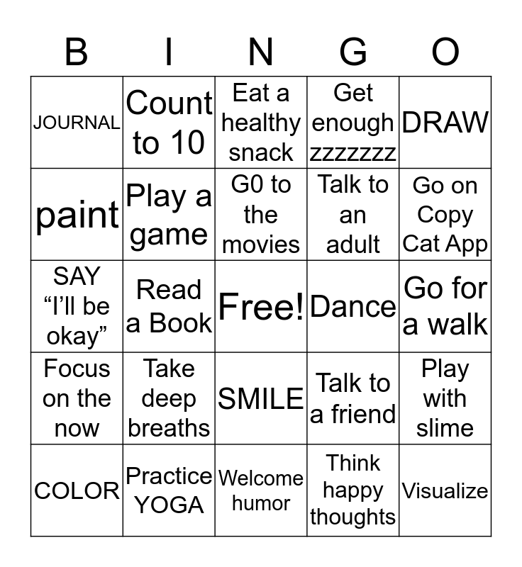 This bingo card has a free space and 24 words: Take deep breaths, Practice YOGA, G0 to the movies, COLOR, DRAW, JOURNAL, paint, Count to 10, Dance, SMILE, Talk to an adult, SAY “I’ll be okay”, Talk to a friend, Play with slime, Play a game, Think happy thoughts, Go for a walk, Eat a healthy snack, Go on Copy Cat App, Read a Book, Visualize, Focus on the now, Get enough zzzzzzz and Welcome humor.