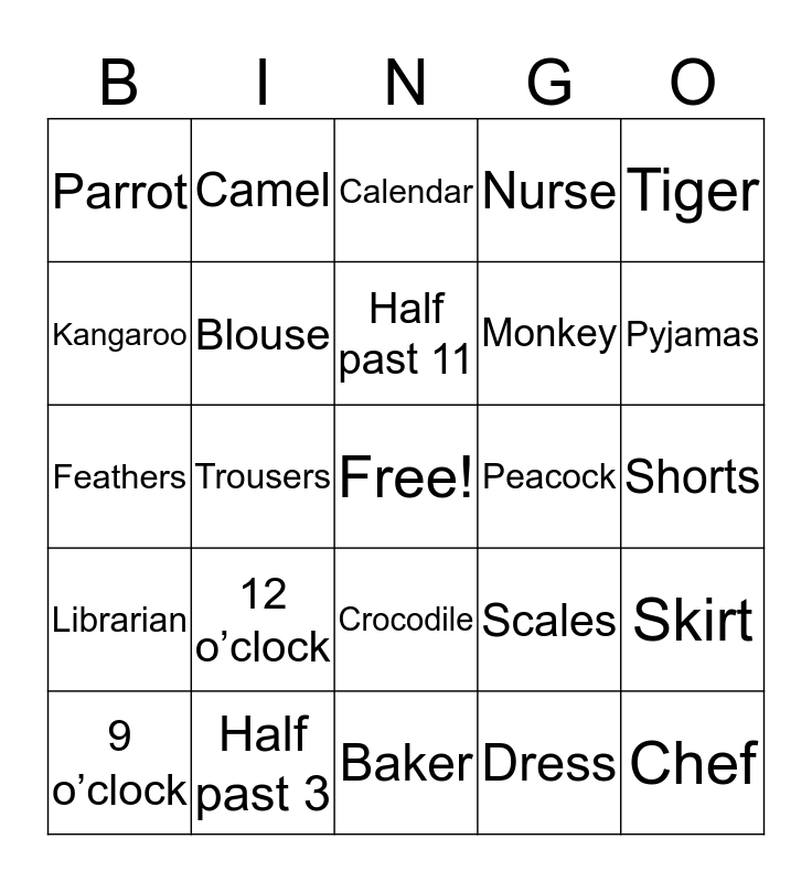 This bingo card has a free space and 24 words: 12 o’clock, Half past 3, Half past 11, 9 o’clock, Tiger, Parrot, Kangaroo, Camel, Peacock, Crocodile, Monkey, Feathers, Scales, Skirt, Blouse, Dress, Shorts, Calendar, Pyjamas, Trousers, Chef, Librarian, Nurse and Baker.