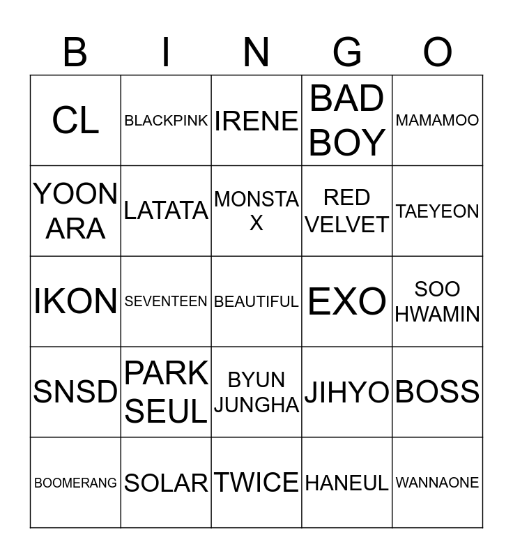This bingo card has 25 words: SNSD, SOLAR, BEAUTIFUL, HANEUL, MAMAMOO, CL, BLACKPINK, IRENE, EXO, BOSS, YOON ARA, LATATA, TWICE, JIHYO, TAEYEON, BOOMERANG, SEVENTEEN, MONSTA X, RED VELVET, SOO HWAMIN, IKON, PARK SEUL, BYUN JUNGHA, BAD BOY and WANNAONE.