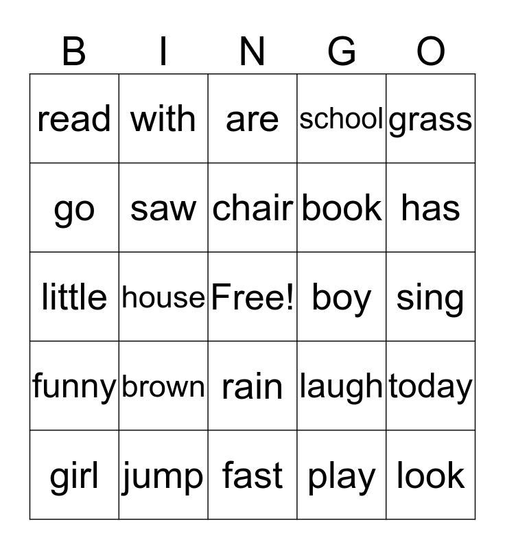 This bingo card has a free space and 24 words: brown, jump, chair, girl, grass, read, go, with, boy, rain, book, little, laugh, today, saw, play, sing, are, has, house, look, funny, school and fast.