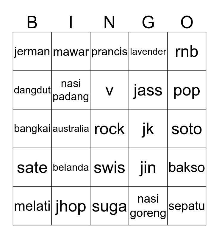 This bingo card has a free space and 24 words: melati, belanda, v, nasi goreng, rnb, jerman, mawar, prancis, jk, soto, bangkai, nasi padang, jin, bakso, dangdut, jhop, suga, lavender, pop, sate, australia, swis, jass and sepatu.