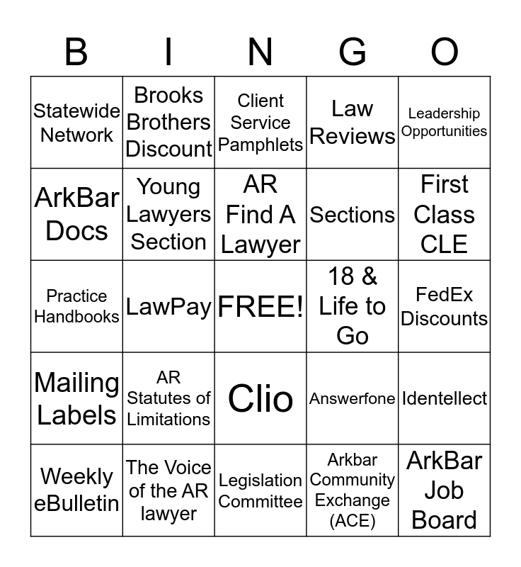 This bingo card has a free space and 42 words: ABA Retirement, AR Find A Lawyer, AR Lawyer Magazine, AR Statutes of Limitations, Arkbar Community Exchange (ACE), Identellect, ArkBar Job Board, Case Summaries, Client Service Pamphlets, Clio, FedEx Discounts, First Class CLE, LawPay, Leadership Opportunities, Legislative Advocacy, Answerfone, Member Directory App, Practice Handbooks, Professional Liability Insurance, Brooks Brothers Discount, ArkBar Docs, fastcase legal research, Membership plus+ package, Statewide Network, Networking Events, Law Practice Mgmt. Website, Sections, Committees, ACE Blogs, Board of Governors, House of Delegates, Mailing Labels, Young Lawyers Section, Legislation Committee, Legislative Corner, Weekly eBulletin, The Voice of the AR lawyer, 18 & Life to Go, Lobbyist, Legal Directories, Law Reviews and Meeting Space.