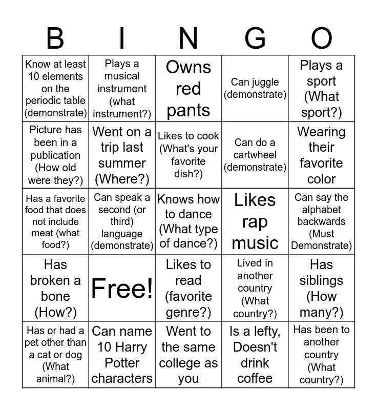 This bingo card has 25 words: Free!, Went to the same college as you, Likes to cook (What's your favorite dish?), Has or had a pet other than a cat or dog (What animal?), Plays a sport (What sport?), Know at least 10 elements on the periodic table (demonstrate), Picture has been in a publication (How old were they?), Plays a musical instrument (what instrument?), Likes rap music, Likes to read (favorite genre?), Can do a cartwheel (demonstrate), Has a favorite food that does not include meat (what food?), Lived in another country (What country?), Has siblings (How many?), Went on a trip last summer (Where?), Has been to another country (What country?), Can say the alphabet backwards (Must Demonstrate), Owns red pants, Wearing their favorite color, Can speak a second (or third) language (demonstrate), Knows how to dance (What type of dance?), Can name 10 Harry Potter characters, Has broken a bone (How?), Can juggle (demonstrate) and Is a lefty, Doesn't drink coffee.