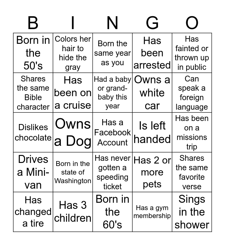 This bingo card has a free space and 24 words: Born in the state of Washington, Has 3 children, Had a baby or grand-baby this year, Has changed a tire, Has fainted or thrown up in public, Born in the 50's, Shares the same Bible character, Colors her hair to hide the gray, Is left handed, Has never gotten a speeding ticket, Owns a white car, Dislikes chocolate, Has 2 or more pets, Shares the same favorite verse, Has been on a cruise, Has a gym membership, Has been on a missions trip, Born the same year as you, Can speak a foreign language, Owns a Dog, Sings in the shower, Drives a Mini-van, Has been arrested and Born in the 60's.