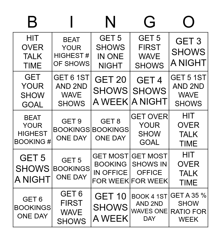 This bingo card has a free space and 24 words: GET 5 BOOKINGS ONE DAY, GET 6 FIRST WAVE SHOWS, GET 20 SHOWS A WEEK, GET 6 BOOKINGS ONE DAY, GET 3 SHOWS A NIGHT, HIT OVER TALK TIME, GET YOUR SHOW GOAL, BEAT YOUR HIGHEST # OF SHOWS, GET OVER YOUR SHOW GOAL, GET MOST BOOKING IN OFFICE FOR WEEK, GET 4 SHOWS A NIGHT, BEAT YOUR HIGHEST BOOKING #, GET MOST SHOWS IN OFFICE FOR WEEK, HIT OVER TALK TIME, GET 6 1ST AND 2ND WAVE SHOWS, BOOK 4 1ST AND 2ND WAVES ONE DAY, HIT OVER TALK TIME, GET 5 SHOWS IN ONE NIGHT, GET 5 1ST AND 2ND WAVE SHOWS, GET 9 BOOKINGS ONE DAY, GET A 35 % SHOW RATIO FOR WEEK, GET 5 SHOWS A NIGHT, GET 5 FIRST WAVE SHOWS and GET 10 SHOWS A WEEK.