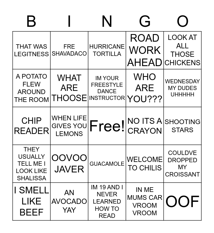 This bingo card has a free space and 24 words: OOVOO JAVER, AN AVOCADO YAY, IM YOUR FREESTYLE DANCE INSTRUCTOR, I SMELL LIKE BEEF, LOOK AT ALL THOSE CHICKENS, THAT WAS LEGITNESS, A POTATO FLEW AROUND THE ROOM, FRE SHAVADACO, NO ITS A CRAYON, GUACAMOLE, WHO ARE YOU???, CHIP READER, WELCOME TO CHILIS, COULDVE DROPPED MY CROISSANT, WHAT ARE THOOSE, IN ME MUMS CAR VROOM VROOM, SHOOTING STARS, HURRICANE TORTILLA, WEDNESDAY MY DUDES UHHHHH, WHEN LIFE GIVES YOU LEMONS, OOF, THEY USUALLY TELL ME I LOOK LIKE SHALISSA, ROAD WORK AHEAD and IM 19 AND I NEVER LEARNED HOW TO READ.