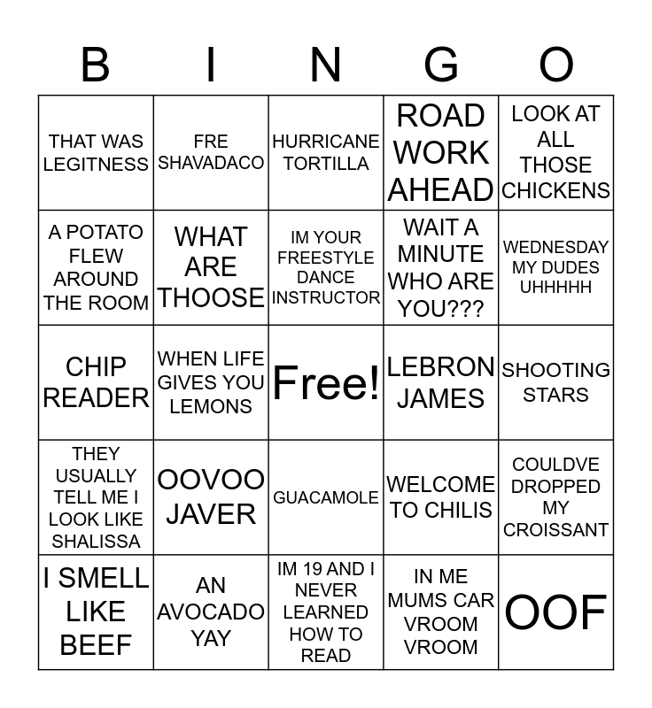 This bingo card has a free space and 24 words: OOVOO JAVER, AN AVOCADO YAY, IM YOUR FREESTYLE DANCE INSTRUCTOR, I SMELL LIKE BEEF, LOOK AT ALL THOSE CHICKENS, THAT WAS LEGITNESS, A POTATO FLEW AROUND THE ROOM, FRE SHAVADACO, LEBRON JAMES, GUACAMOLE, WAIT A MINUTE WHO ARE YOU???, CHIP READER, WELCOME TO CHILIS, COULDVE DROPPED MY CROISSANT, WHAT ARE THOOSE, IN ME MUMS CAR VROOM VROOM, SHOOTING STARS, HURRICANE TORTILLA, WEDNESDAY MY DUDES UHHHHH, WHEN LIFE GIVES YOU LEMONS, OOF, THEY USUALLY TELL ME I LOOK LIKE SHALISSA, ROAD WORK AHEAD and IM 19 AND I NEVER LEARNED HOW TO READ.