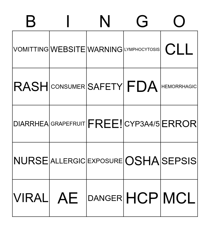 This bingo card has a free space and 59 words: UIAP, AE, PC, NURSE, HCP, PATIENT, CONSUMER, TRIAL, FDA, PREGNANCY, LYMPHOCYTOSIS, FATIGUE, RASH, INFECTION, NAUSEA, VOMITTING, MCL, CLL, BTKI, SAFETY, CYP3A4/5, WARNING, VIRAL, SEPSIS, CONTUSION, EPISTAXIS, PETECHIAE, THROMBOCYTOPENIA, HEMORRHAGIC, TRADENAME, ANTICOAGULANT, CONGENITAL, OVERDOSE, PHARMACY, WEBSITE, CARCINOGENESIS, TOXICITY, GRAPEFRUIT, SEVILLE, DIARRHEA, BLEEDING, ALLERGIC, ERROR, PACKAGING, REGULATIONS, HAZARD, INHALATION, MSDS, EXPOSURE, DANGER, RISK, COMPLIANCE, PERSISTANCY, CELLULOSE, GENOTOXICITY, OSHA, WELCOMECALL, FORMS and ABBREVIATIONS.