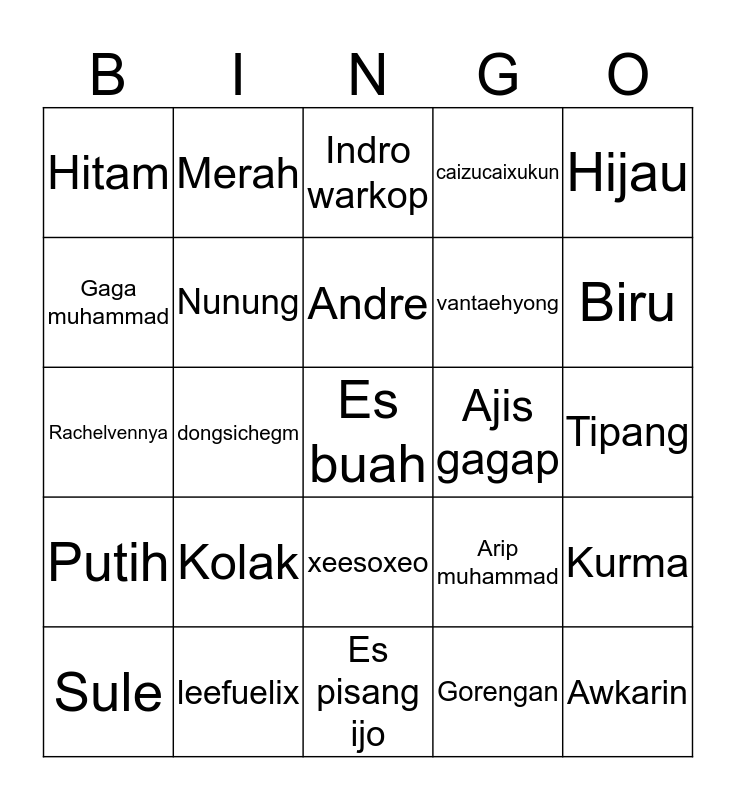 This bingo card has a free space and 24 words: Kolak, leefuelix, Andre, Sule, Hijau, Hitam, Gaga muhammad, Merah, Ajis gagap, xeesoxeo, vantaehyong, Rachelvennya, Arip muhammad, Kurma, Nunung, Gorengan, Tipang, Indro warkop, Biru, dongsichegm, Awkarin, Putih, caizucaixukun and Es pisang ijo.