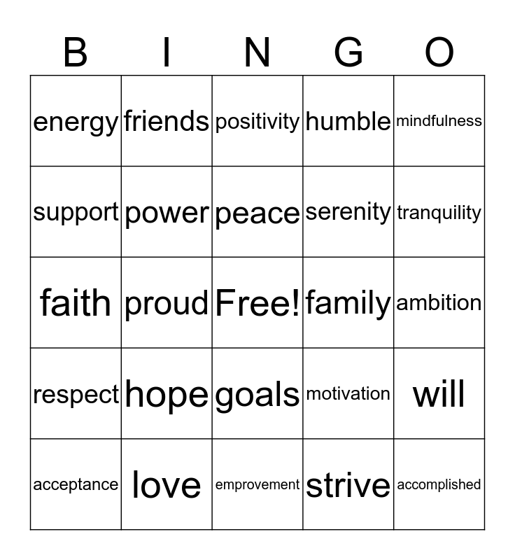 This bingo card has a free space and 24 words: hope, love, peace, acceptance, mindfulness, energy, support, friends, family, goals, serenity, faith, motivation, will, power, strive, ambition, positivity, tranquility, proud, accomplished, respect, humble and emprovement.