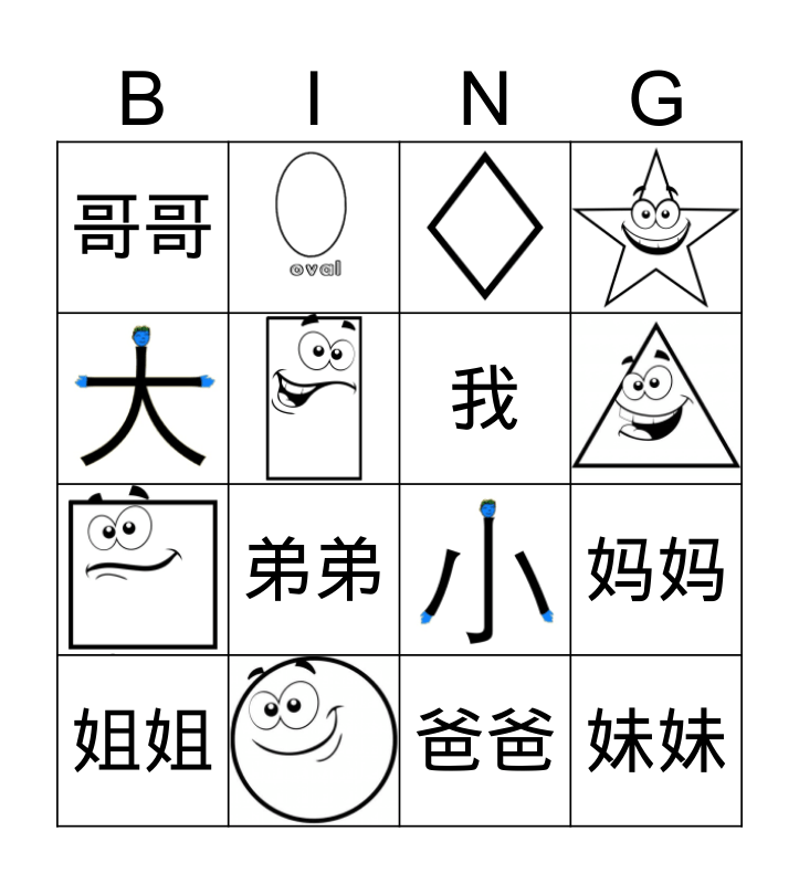 This bingo card has 9 images and 7 words: 妈妈, 哥哥, 爸爸, 姐姐, 弟弟, 我 and 妹妹.