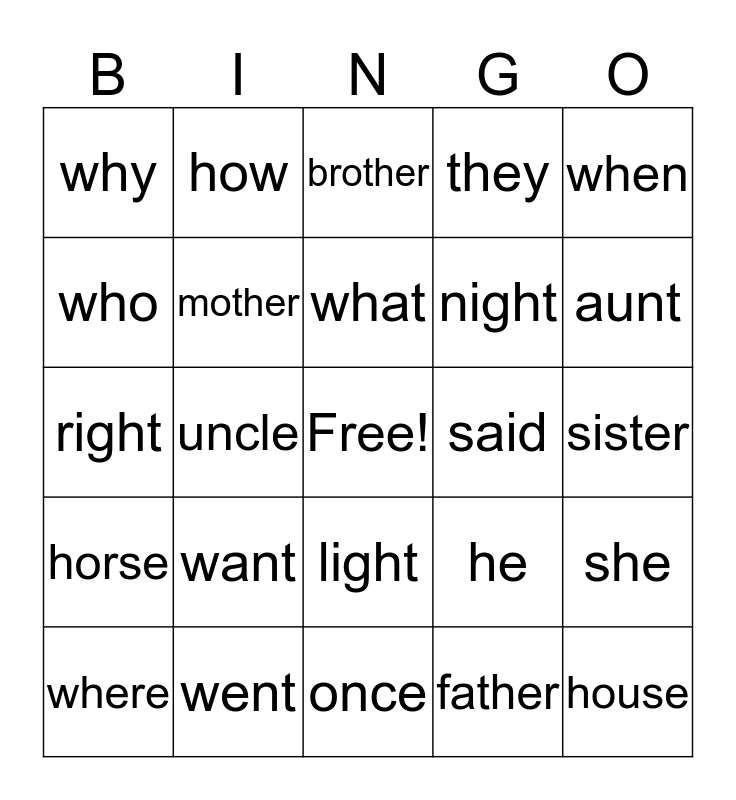 This bingo card has a free space and 24 words: want, went, what, where, when, why, who, how, said, light, night, right, he, she, mother, father, sister, brother, aunt, uncle, house, horse, they and once.