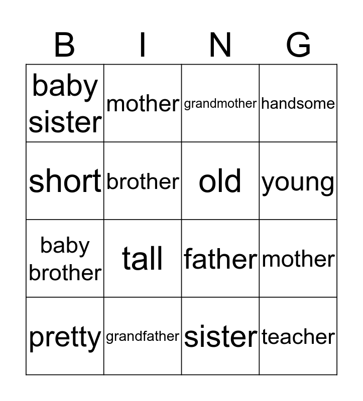 This bingo card has 16 words: grandfather, mother, grandmother, baby sister, baby brother, mother, father, sister, short, brother, pretty, handsome, tall, young, old and teacher.