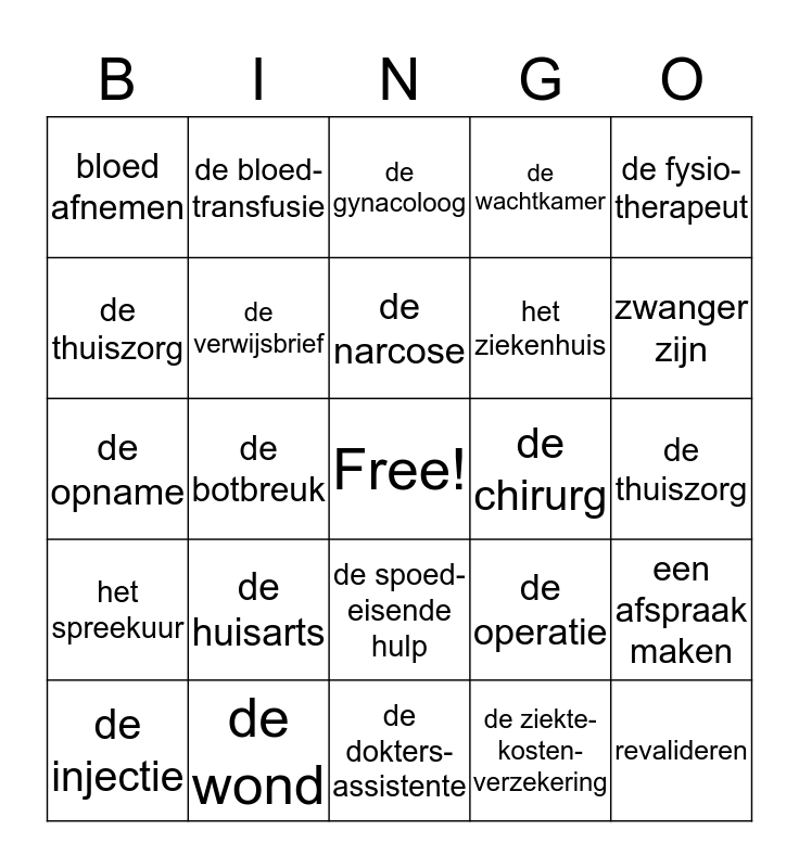 This bingo card has a free space and 24 words: de huisarts, de wond, de narcose, de injectie, de fysio-therapeut, bloed afnemen, de thuiszorg, de bloed-transfusie, de chirurg, de spoed- eisende hulp, het ziekenhuis, de opname, de operatie, een afspraak maken, de verwijsbrief, de ziekte-kosten-verzekering, de thuiszorg, de gynacoloog, zwanger zijn, de botbreuk, revalideren, het spreekuur, de wachtkamer and de dokters-assistente.
