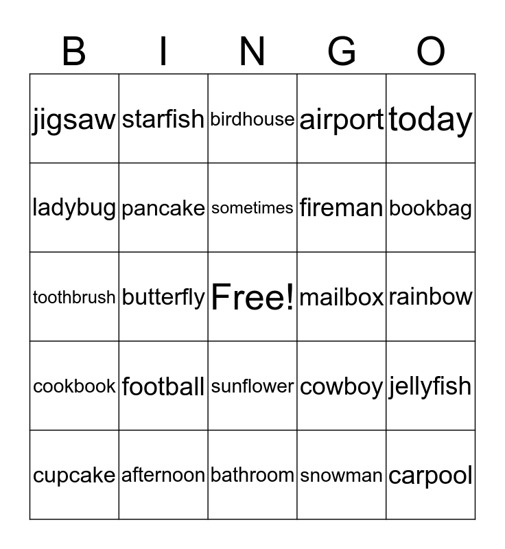This bingo card has a free space and 24 words: football, afternoon, sometimes, cupcake, today, jigsaw, ladybug, starfish, mailbox, sunflower, fireman, toothbrush, cowboy, jellyfish, pancake, snowman, rainbow, birdhouse, bookbag, butterfly, carpool, cookbook, airport and bathroom.