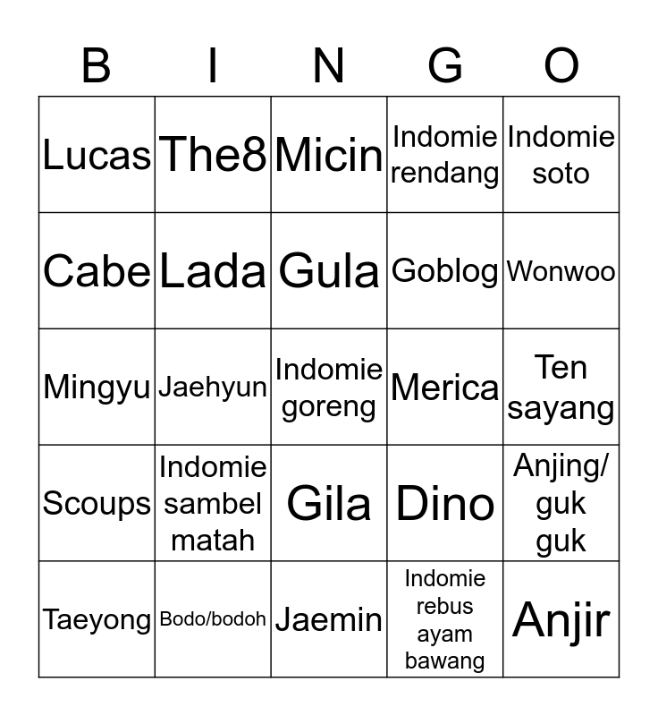 This bingo card has a free space and 24 words: Indomie sambel matah, Bodo/bodoh, Gula, Taeyong, Indomie soto, Lucas, Cabe, The8, Merica, Gila, Goblog, Mingyu, Dino, Anjing/ guk guk, Lada, Indomie rebus ayam bawang, Ten sayang, Micin, Wonwoo, Jaehyun, Anjir, Scoups, Indomie rendang and Jaemin.