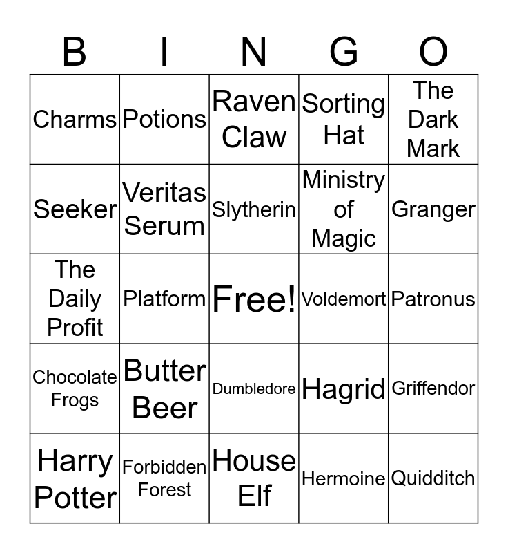 This bingo card has a free space and 29 words: Harry Potter, Hogwarts, Platform, Ron Weasley, Charms, Raven Claw, Veritas Serum, Butter Beer, Voldemort, Forbidden Forest, Patronus, Quidditch, House Elf, Hermoine, Granger, Azkaban, Dumbledore, Chocolate Frogs, The Dark Mark, The Daily Profit, Hagrid, Marauder's map, Ministry of Magic, Seeker, Sorting Hat, Potions, Griffendor, Slytherin and Hufflepuff.