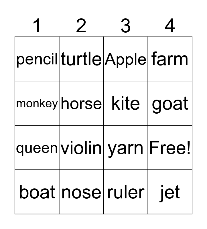 This bingo card has 20 words: Free!, Free, Apple, car, boat, monkey, nose, pencil, queen, turtle, violin, yarn, horse, jet, kite, leaf, goat, farm, ruler and wolf.
