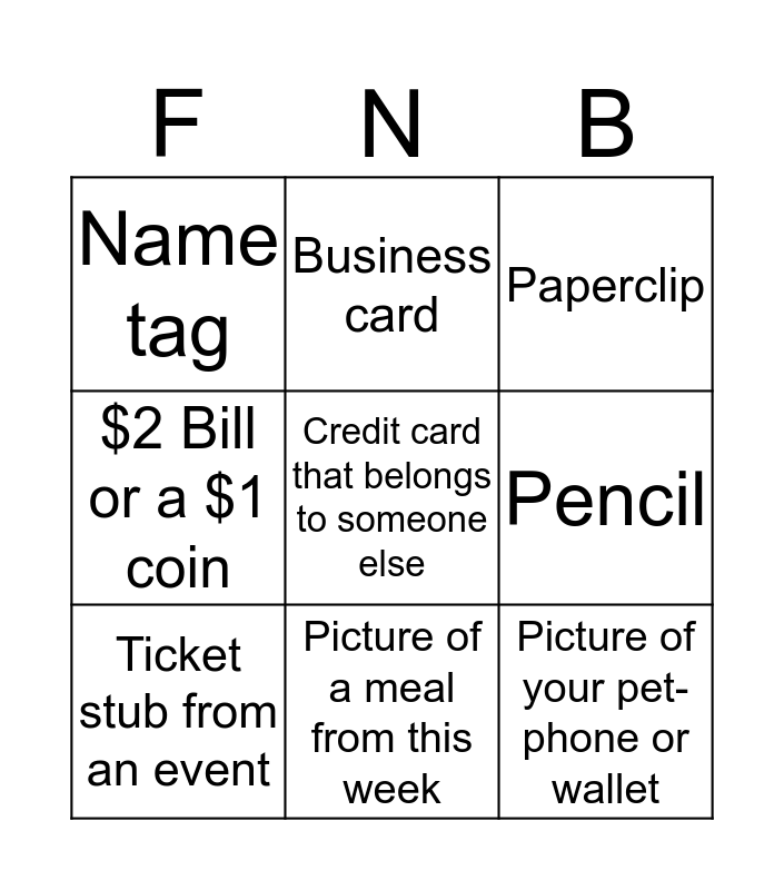 This bingo card has 9 words: Ticket stub from an event, Paperclip, Business card, $2 Bill or a $1 coin, Name tag, Pencil, Credit card that belongs to someone else, Picture of your pet- phone or wallet and Picture of a meal from this week.