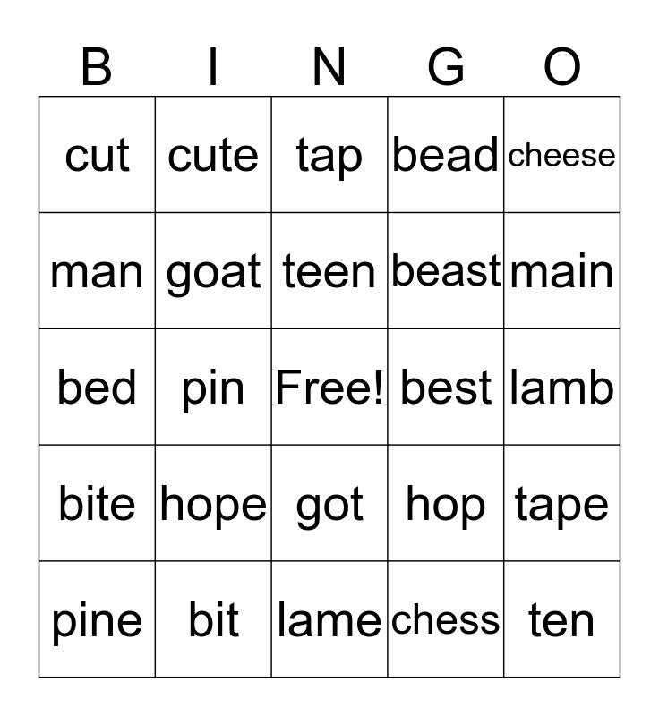 This bingo card has a free space and 24 words: hope, bit, teen, pine, cheese, cut, man, cute, best, got, beast, bed, hop, tape, goat, chess, lamb, tap, main, pin, ten, bite, bead and lame.