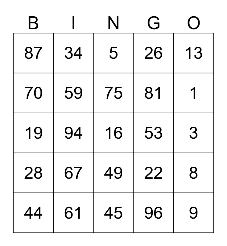 This bingo card has 25 words: 67, 45, 75, 44, 13, 87, 70, 34, 53, 49, 81, 19, 22, 8, 59, 9, 3, 5, 1, 94, 16, 61, 28, 26 and 96.