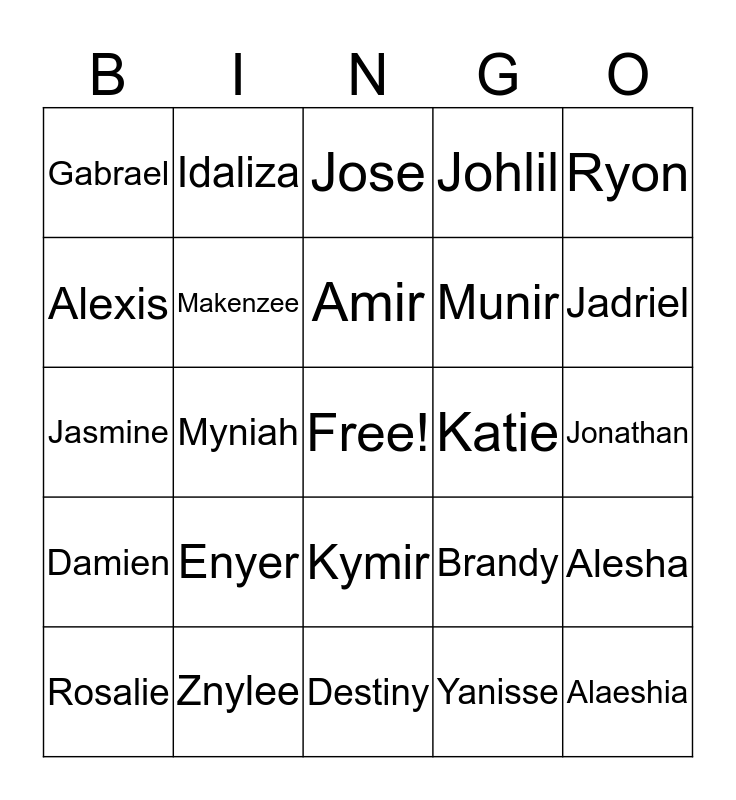 This bingo card has a free space and 24 words: Enyer, Znylee, Amir, Rosalie, Ryon, Gabrael, Alexis, Idaliza, Katie, Kymir, Munir, Jasmine, Brandy, Alesha, Makenzee, Yanisse, Jonathan, Jose, Jadriel, Myniah, Alaeshia, Damien, Johlil and Destiny.