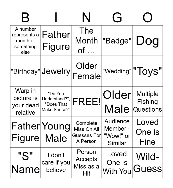 This bingo card has a free space and 39 words: "J" Name, Mother Figure, "M" Name, Jewelry, "S" Name, Complete Miss On All Guesses For A Person, Older Female, Cat, Dog, Father Figure, "Do You Understand?", "Does That Make Sense?", "Badge", Wild-Guess, Multiple Fishing Questions, Older Male, Young Male, Tragedy or unexpected, A number represents a month or something else, Were you with them, did you go to the hospital?, Audience Member - "Wow!" or Similar, "Birthday", Person Accepts Miss as a Hit, "Wedding", "Toys", "Breathing Trouble", "R" Name, "Head Area", Cancer, "Chest Area", Father Figure, This one must have been for someone else, Telling someone what they want to hear, The Month of …, I don't care if you believe, Loved One is With You, Loved One is Proud of You, Loved One is Fine, Warp in picture is your dead relative and Anyone Lost a child.