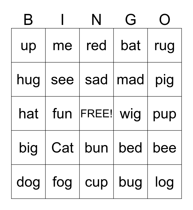 This bingo card has a free space and 24 words: Cat, fog, sad, dog, rug, up, hug, me, wig, bun, mad, hat, bed, bee, see, bug, pup, red, pig, fun, log, big, bat and cup.