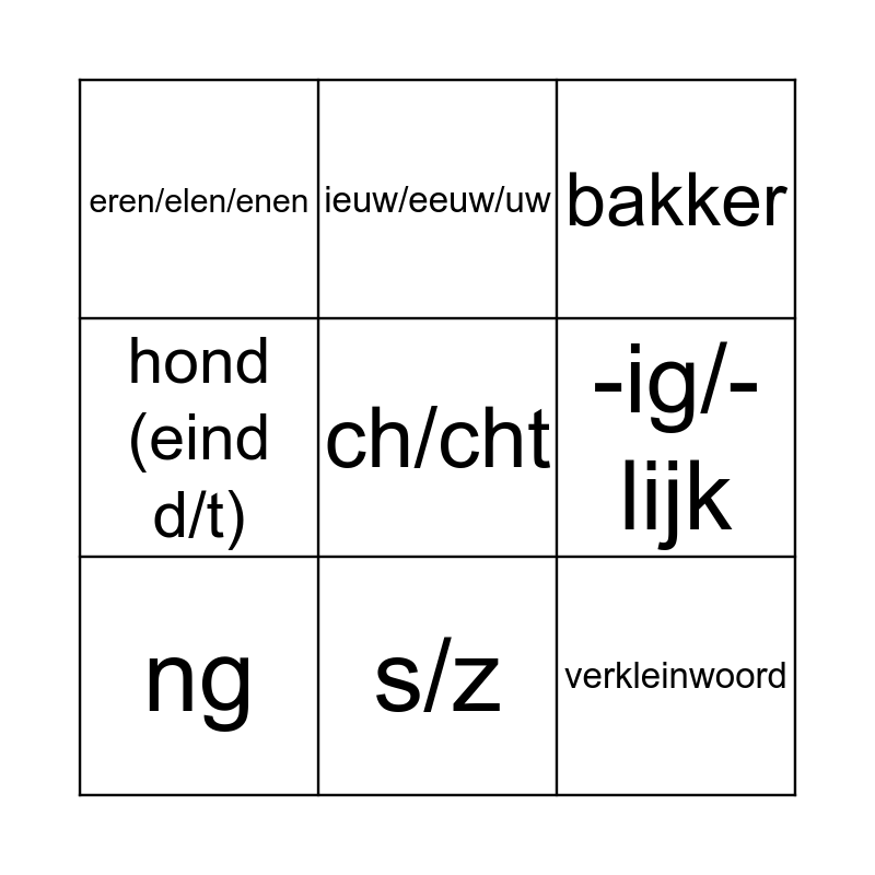 This bingo card has 16 words: au/ou, ge/be/ver, bakker, eren/elen/enen, verkleinwoord, ieuw/eeuw/uw, jager, hijskraan, ch/cht, -ig/-lijk, ei/ij, hond (eind d/t), f/v, s/z, ng and nk.