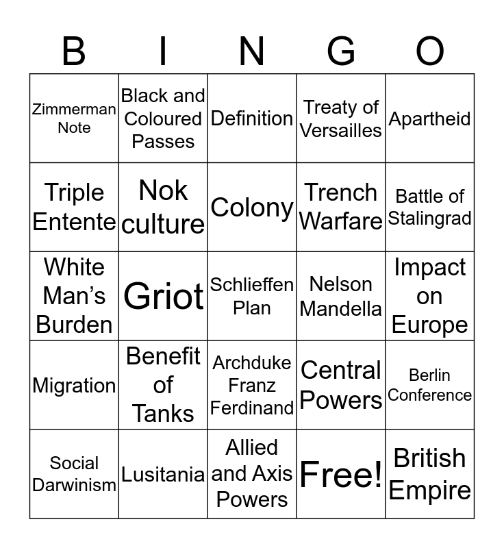 This bingo card has 32 words: Free!, Bantu-speaking peoples, Griot, Islam, Migration, Nok culture, Apartheid, Berlin Conference, Black and Coloured Passes, British Empire, Colony, Definition, Ethiopian Resistance, Mohandis K. Gandhi, Nelson Mandella, Salt March, Social Darwinism, White Man’s Burden, Archduke Franz Ferdinand, Benefit of Tanks, Central Powers, Expectations vs. Reality, Impact on Europe, Lusitania, Schlieffen Plan, Treaty of Versailles, Trench Warfare, Triple Entente, Zimmerman Note, Allied and Axis Powers, Appeasement and Battle of Stalingrad.
