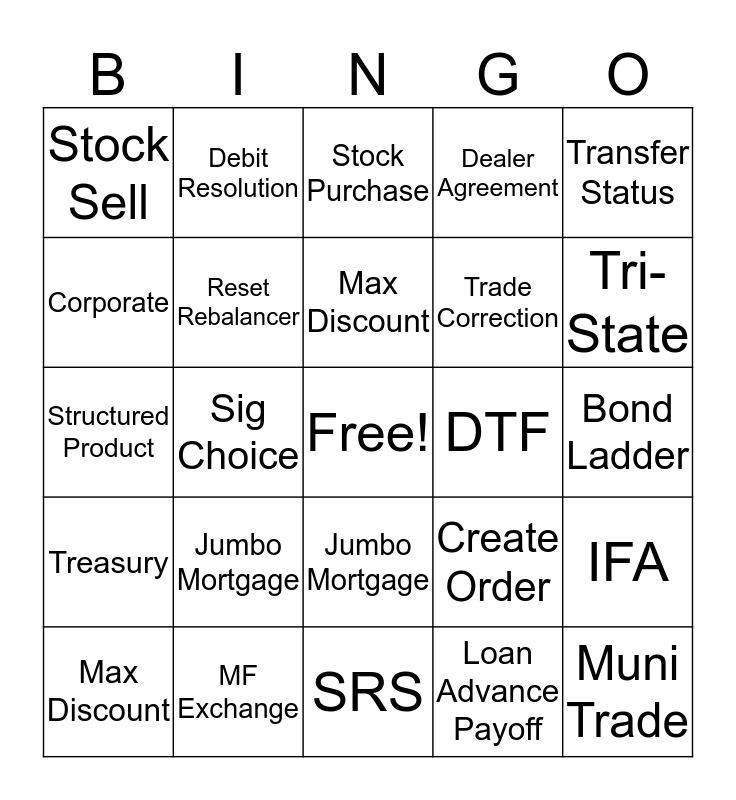 This bingo card has a free space and 57 words: Angry Caller, Max Discount, Address Change, Stock Sell, SRS, Tri-State, Reset Rebalancer, Breakpoints, Trade Correction, Sig Port, Dealer Agreement, DNOS, Dividends, AFR, Cost Basis, End-Client, Transfer Status, Sig Choice, Sig Annuity, Muni Trade, DTF, Transfer Liquidation, Create Order, Stock Purchase, Angry Caller, Max Discount, Muni, Stock Sell, Tri-State, Trade Correction, Stock Purchase, Denise Tolle, Loan Advance Payoff, Prime, Bond Ladder, Corporate, Private REIT, Structured Product, CD, Treasury, Debit Resolution, Jumbo Mortgage, IFA, Tax Line, Denise Tolle, Debit Resolution, Jumbo Mortgage, MF Exchange, Misdirected, Wire, DTF, Loan Advance Payoff, Statements, Tax Line, GLM, IFA and 529.