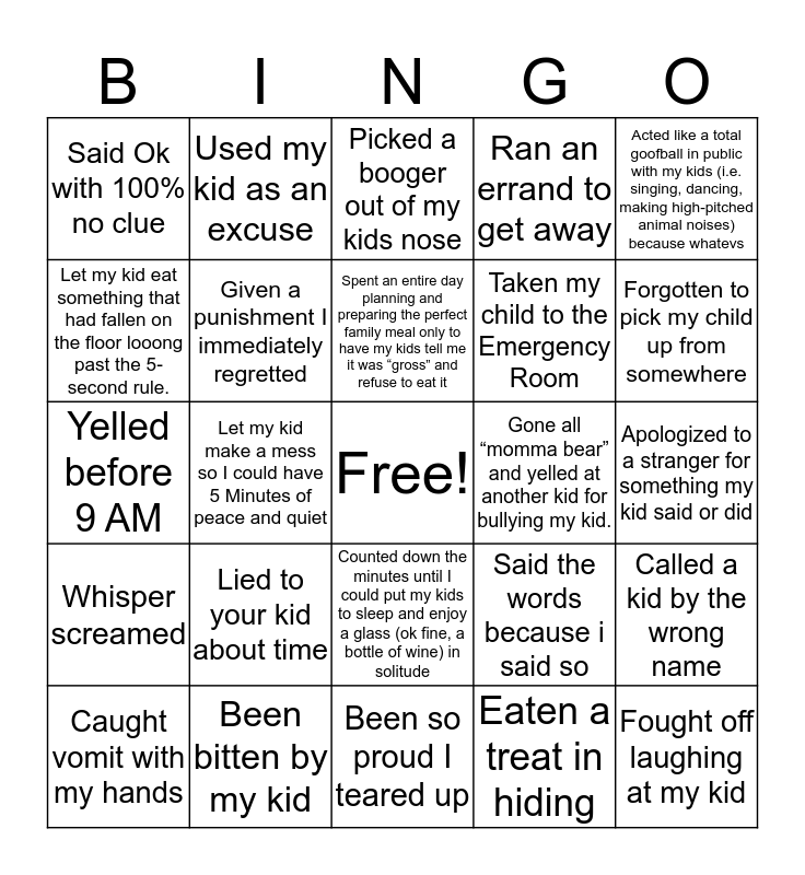 This bingo card has a free space and 24 words: Lied to your kid about time, Been bitten by my kid, Spent an entire day planning and preparing the perfect family meal only to have my kids tell me it was “gross” and refuse to eat it, Caught vomit with my hands, Acted like a total goofball in public with my kids (i.e. singing, dancing, making high-pitched animal noises) because whatevs, Said Ok with 100% no clue, Let my kid eat something that had fallen on the floor looong past the 5-second rule., Used my kid as an excuse, Gone all “momma bear” and yelled at another kid for bullying my kid., Counted down the minutes until I could put my kids to sleep and enjoy a glass (ok fine, a bottle of wine) in solitude, Taken my child to the Emergency Room, Yelled before 9 AM, Said the words because i said so, Called a kid by the wrong name, Given a punishment I immediately regretted, Eaten a treat in hiding, Apologized to a stranger for something my kid said or did, Picked a booger out of my kids nose, Forgotten to pick my child up from somewhere, Let my kid make a mess so I could have 5 Minutes of peace and quiet, Fought off laughing at my kid, Whisper screamed, Ran an errand to get away and Been so proud I teared up.