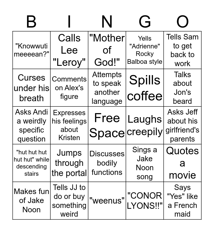 This bingo card has a free space and 24 words: Jumps through the portal, Tells JJ to do or buy something weird, Attempts to speak another language, Makes fun of Jake Noon, Tells Sam to get back to work, "Knowwuti meeeean?", Curses under his breath, Calls Lee "Leroy", Laughs creepily, Discusses bodily functions, Spills coffee, Asks Andi a weirdly specific question, Sings a Jake Noon song, Quotes a movie, Comments on Alex's figure, "CONOR LYONS!!", Asks Jeff about his girlfriend's parents, "Mother of God!", Talks about Jon's beard, Expresses his feelings about Kristen, Says "Yes" like a French maid, "hut hut hut hut hut" while descending stairs, Yells "Adrienne" Rocky Balboa style and "weenus".