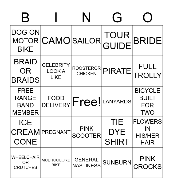 This bingo card has a free space and 24 words: PREGNANT, MULTICOLORD BIKE, ROOSTEROR CHICKEN, WHEELCHAIR OR CRUTCHES, BRIDE, DOG ON MOTOR BIKE, BRAID OR BRAIDS, CAMO, LANYARDS, PINK SCOOTER, PIRATE, FREE RANGE BAND MEMBER, TIE DYE SHIRT, FLOWERS IN HIS/HER HAIR, CELEBRITY LOOK A LIKE, SUNBURN, BICYCLE BUILT FOR TWO, SAILOR, FULL TROLLY, FOOD DELIVERY, PINK CROCKS, ICE CREAM CONE, TOUR GUIDE and GENERAL NASTINESS.