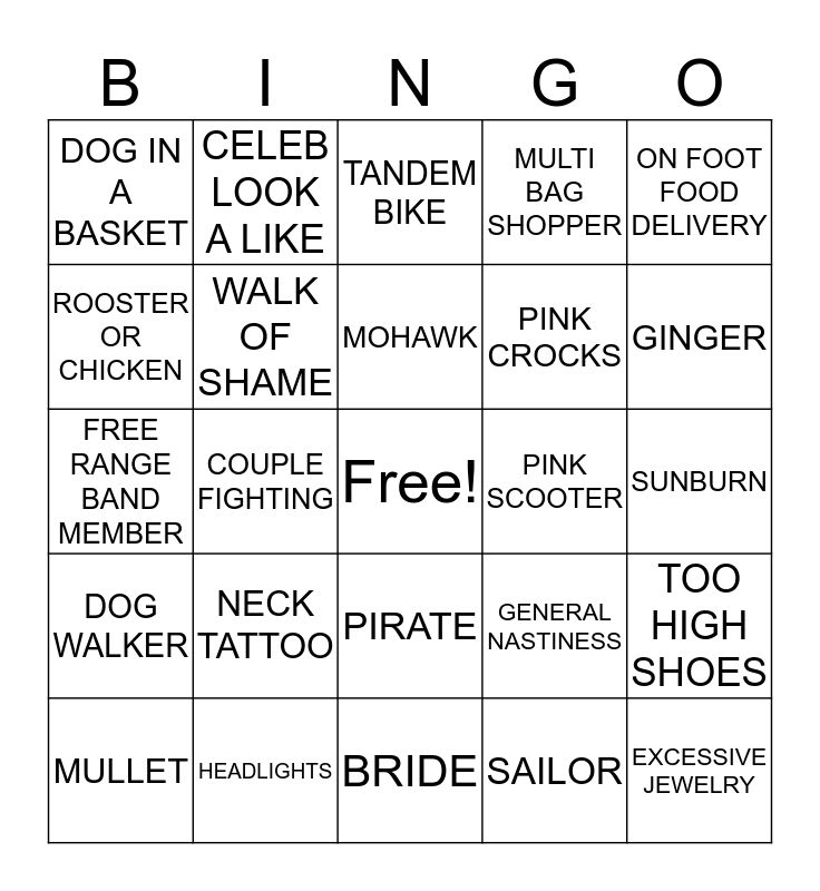 This bingo card has a free space and 24 words: NECK TATTOO, HEADLIGHTS, MOHAWK, MULLET, ON FOOT FOOD DELIVERY, DOG IN A BASKET, ROOSTER OR CHICKEN, CELEB LOOK A LIKE, PINK SCOOTER, PIRATE, PINK CROCKS, FREE RANGE BAND MEMBER, GENERAL NASTINESS, TOO HIGH SHOES, WALK OF SHAME, SAILOR, SUNBURN, TANDEM BIKE, GINGER, COUPLE FIGHTING, EXCESSIVE JEWELRY, DOG WALKER, MULTI BAG SHOPPER and BRIDE.