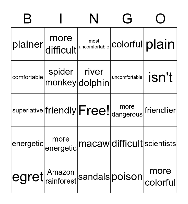 This bingo card has a free space and 39 words: jaguar, dangerous, sloth, spider monkey, egret, macaw, river dolphin, calm, plain, energetic, friendly, colorful, more colorful, friendlier, more dangerous, more energetic, calmer, plainer, puzzle, difficult, comfortable, sandals, uncomfortable, isn't, cheap, bracelet, expensive, easier, easiest, more difficult, most difficult, more uncomfortable, most uncomfortable, Amazon rainforest, poison, poison dart frog, scientists, superlative and comparative.