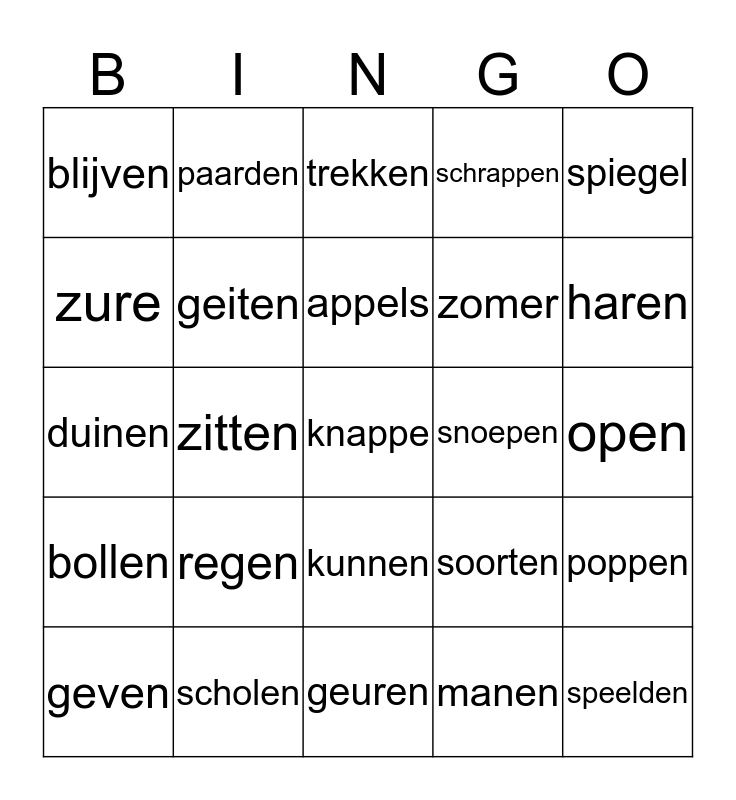 This bingo card has 25 words: regen, geuren, appels, geven, spiegel, blijven, zure, paarden, snoepen, kunnen, zomer, duinen, soorten, poppen, geiten, speelden, open, trekken, haren, zitten, knappe, scholen, bollen, schrappen and manen.