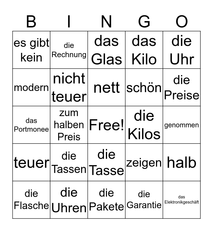 This bingo card has a free space and 45 words: die Apotheke, das Elektronikgeschäft, der Euro, die Flasche, die Flaschen, die Garantie, das Glas, die Gläser, die Uhr, die Uhren, das Kilo, die Kilos, die Tasse, die Tassen, das Paket, die Pakete, die Bankkarte, das Portmonee, der Preis, die Preise, die Rechnung, die Rechnungen, die Tasche, es gibt kein, nehmen, genommen, zurückgeben, zurückgegeben, zeigen, teuer, günstig, halb, etwas gegen, stark, aus Leder, zum halben Preis, schmutzig, etwas für, leer, nett, modern, schön, zum Supermarkt, nicht teuer and sauber.