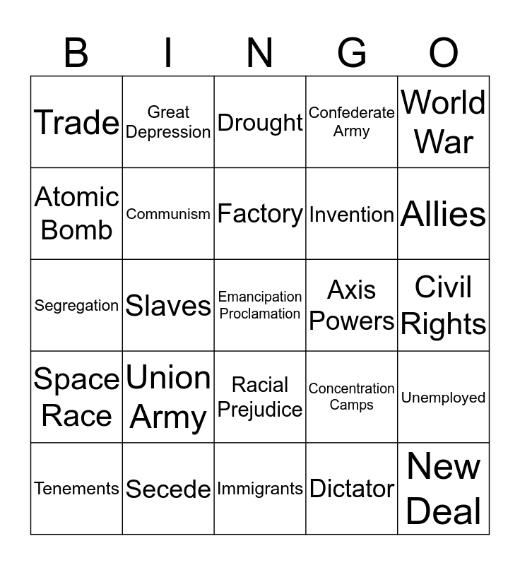 This bingo card has a free space and 24 words: Union Army, Secede, Factory, Tenements, World War, Trade, Atomic Bomb, Great Depression, Axis Powers, Racial Prejudice, Invention, Segregation, Concentration Camps, Unemployed, Communism, Dictator, Civil Rights, Drought, Allies, Slaves, New Deal, Space Race, Confederate Army and Immigrants.